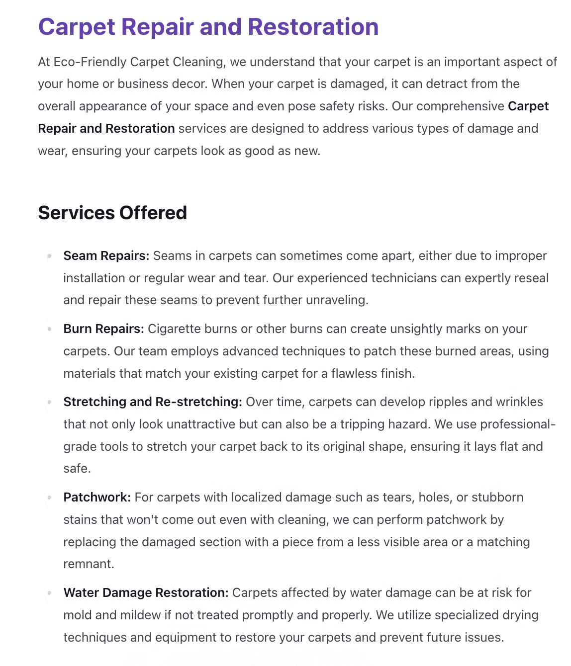 Every page in Rebolt is composed of sections. Each section can be moved, deleted, or customized but when the page is first created there is a default layout and all the text is generated from AI. The AI is instructed to generate SEO-optimized text for the given section. It also picks out the photo to use for the given section out of a list of user-provided photos. All of this means it is possible to build fully featured websites in just a matter of minutes. However, since all of the sections are fully customizable, it gives you more flexibility to refine it and put in your own content. The combination of AI-generated sections and full customizations gives you the best of both worlds.